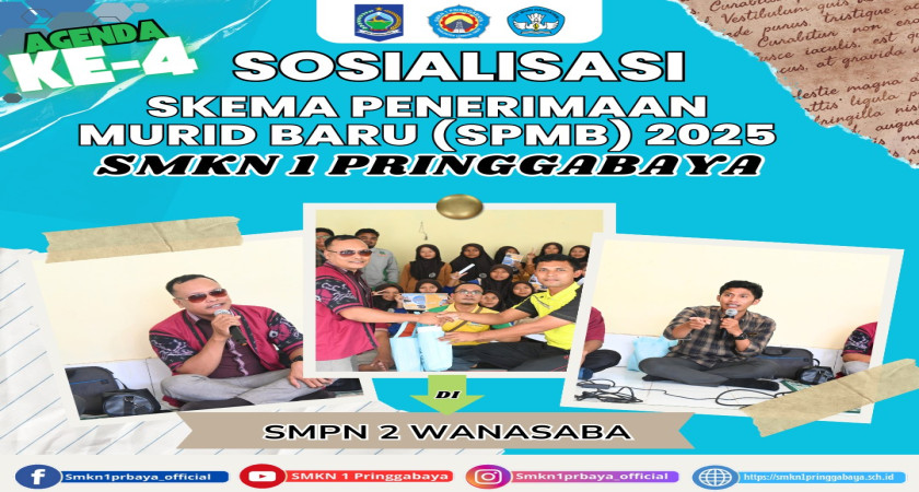 Sosialisasi Sistem Penerimaan Murid Baru (SPMB) SMKN 1 Pringgabaya telah sukses diselenggarakan di beberapa sekolah, termasuk SMPN 2 Wanasaba pada Sabtu, 08 Februari 2025, SMPN 4 Pringgabaya pada Kamis, 13 Februari 2025, dan SMPN 3 Pringgabaya pada Sabtu, 15 Februari 2025.